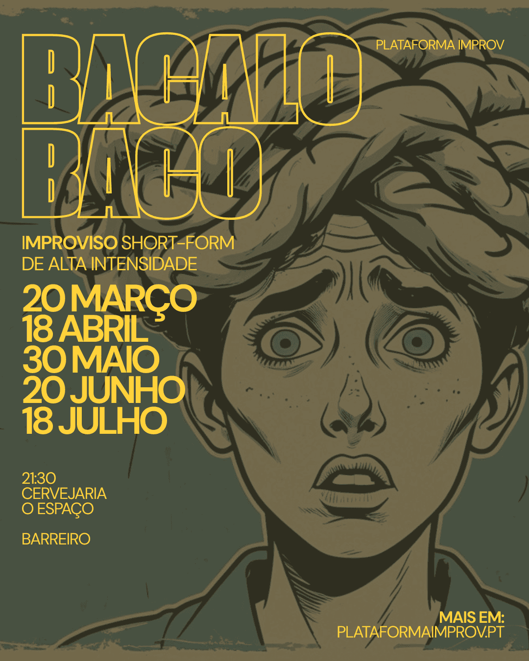 BACALOBACO é o formato short-form de teatro de improviso que promete trazer muito boa disposição às noites do Barreiro. Neste formato, um grupo de improvisadores pindaíbos junta-se em palco para trazer as mais estapafúrdias invenções que forem capazes de esputar , evitando piadas chumbregas e sem demasiada filáucia, a partir, claro, das sugestões do nosso estimado público mequetrefe. Um MC galalau será o responsável por dinamizar jogos rápidos de improviso e com isto proporcionar a todos os presentes algum bacalobaco sem dar uma de que se trata apenas de uma bulhufa. Anda daí se estiveres numa de ter um chilique a ver um bando de serelepes a criar mixurucas no momento. Para auxílio na compreensão desta sinopse, aconselhamos o uso do Priberam.